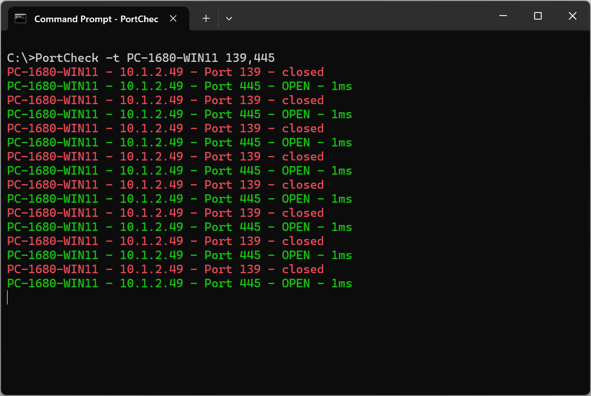Just run PortCheck.exe from the command line to test a TCP port: PortCheck.exe <hostname> <port number>. Example: PortCheck.exe Fileserver1 445