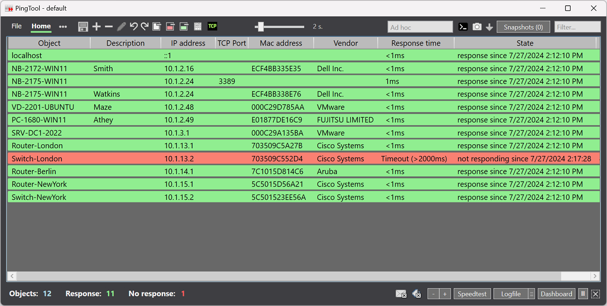 In the graphical user interface, a red-colored object indicates that the device is currently unreachable, meaning it does not respond to ping requests or to checks on the specified TCP port. Devices that do respond successfully are displayed in green, along with their measured response time.